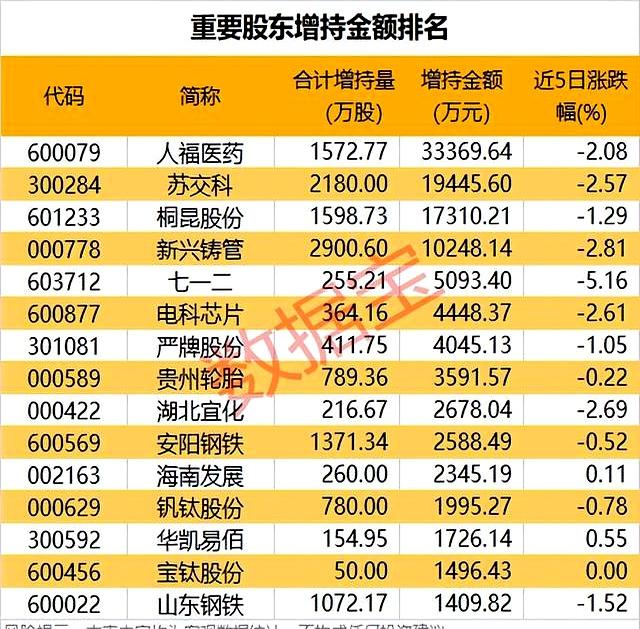 其中,人福医药以3.33亿元的增持金额领跑,苏交科、桐昆股份分别获增持1.94亿元、1.73亿元。