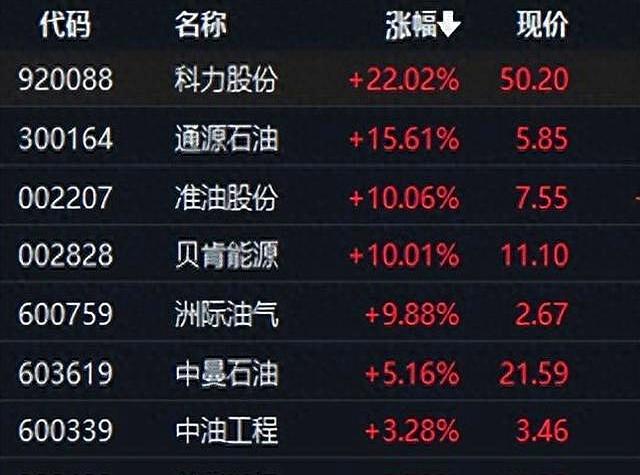 盘面上,受国际局势影响,油气板块连续走强,科力股份、通源石油等个股涨幅超过10%,贝肯能源、洲际油气更是直接封死涨停。