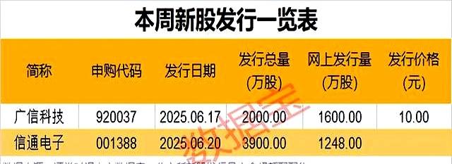 本周仅有两只新股可申购——广信科技(周二)和信通电子(周五),合计募资7.41亿元。