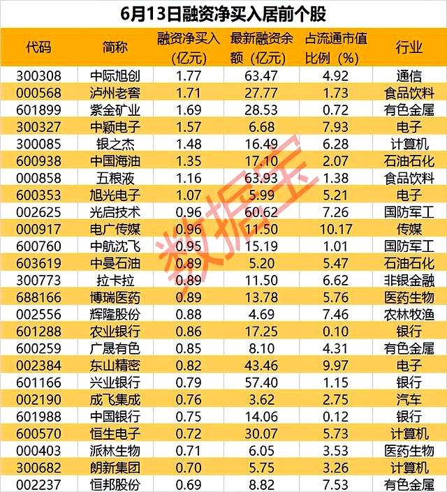 融资融券数据显示,6月13日,市场融资余额小幅回落,但仍有45只个股获得杠杆资金超5000万元的净买入。